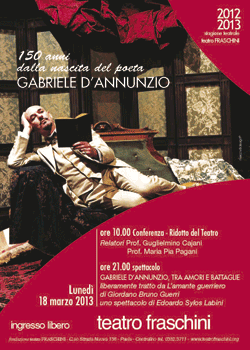 2013 marks the 150th anniversary of Gabriele d’Annunzio’s birth. For this occasion, his life as a central figure of Italian history and literature at the turn of the nineteenth century is narrated in the play Gabriele d’Annunzio, tra amori e battaglie, written by Edoardo Sylos Labini and Francesco Sala, with Giordano Bruno Guerri, the poet’s most important biographer and president of Vittoriale (www.vittoriale.it), serving as a consultant.
